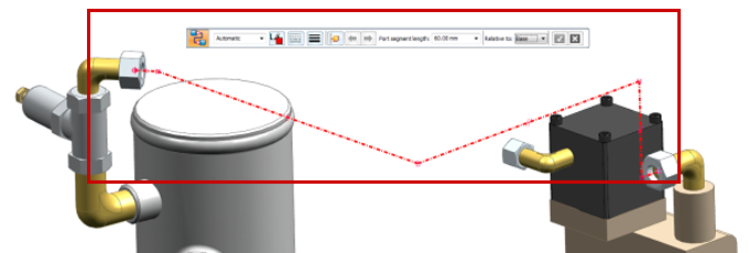 快速布管命令在 3D 草圖環(huán)境中可用,因此可自動在兩個點之間創(chuàng)建 3D 草圖路徑。此命令在 3D 草圖中稱為管線路徑,且此命令條包含的選項比標準快速布管命令條要多。在 3D 草圖中使用此命令時,可使用其他選項來應用顏色和線條樣式,以及創(chuàng)建相對于用戶定義坐標系的路徑。
