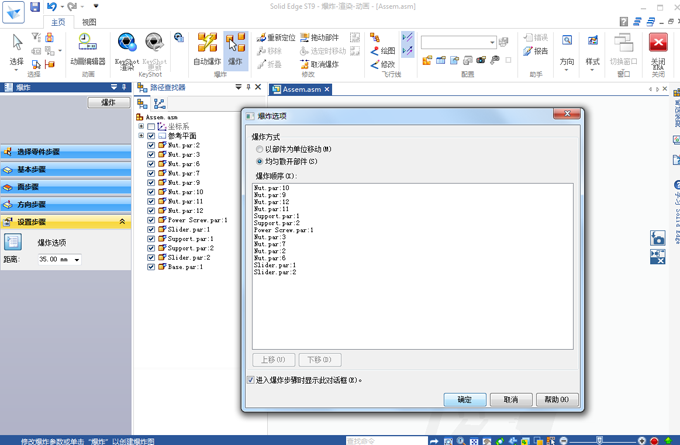 設(shè)置爆炸距離35mm,在爆炸方式中選擇均勻散開部件,單擊確定。