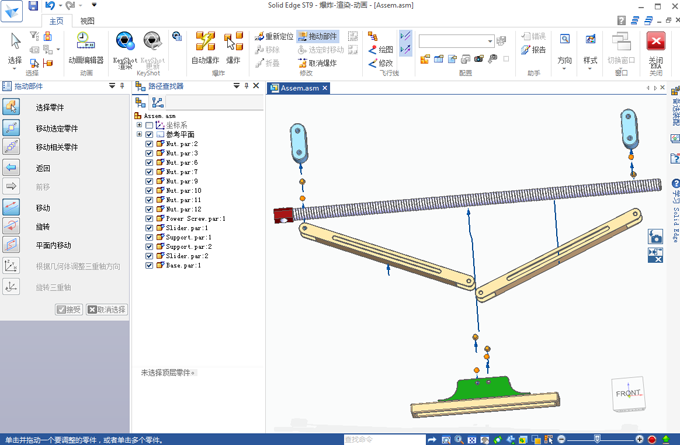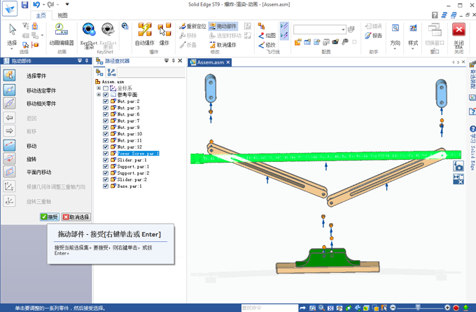 在主頁菜單修改選項卡中選擇拖動部件按鈕,在彈出的拖動部件選項卡中選中移動選定部件和移動按鈕,單擊接受后拖動鼠標(biāo)移動零件。
