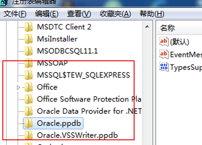 5、運(yùn)行refedit,HKEY_LOCAL_MACHINESYSTEMCurrentControlSetServicesEventlogApplication, 刪除所有Oracle入口。